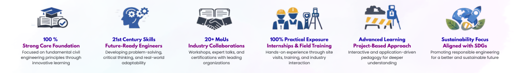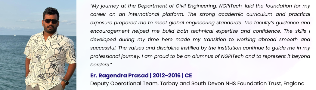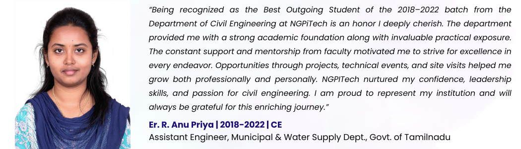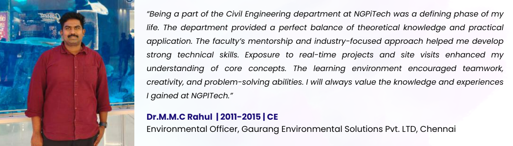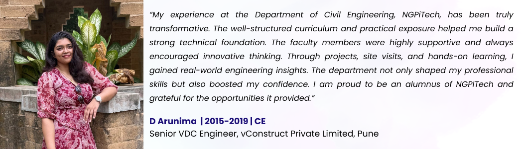 Civil Engineering at NGPiTECH is thoughtfully designed to equip students with essential 21st-century skills by addressing real-world and global challenges while building a strong foundation in core engineering principles. The program emphasizes fundamental knowledge through innovative pedagogy, incorporating interactive learning methods, project-based approaches, and problem-solving techniques that enhance conceptual clarity. Alongside academic excellence, students gain field-oriented skills through internships, industrial visits, and hands-on training, enabling them to connect theory with practical applications. Exposure to latest technologies is ensured through strategic Memorandums of Understanding (MoUs) with leading industries and organizations, providing opportunities for workshops, expert lectures, and certification programs. With a strong focus on sustainability and responsible engineering practices, the department nurtures students to contribute effectively toward achieving the Sustainable Development Goals (SDGs), ultimately shaping them into competent, innovative, and socially responsible civil engineers ready to build the future.