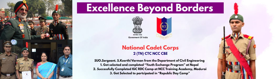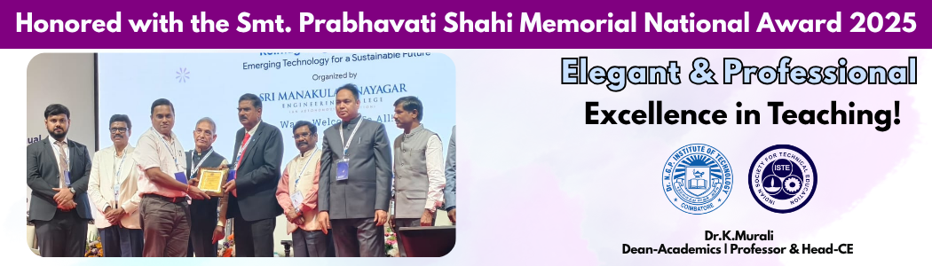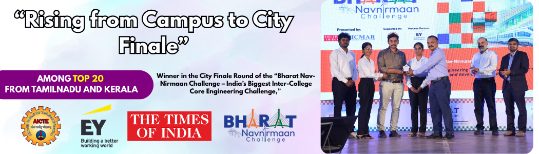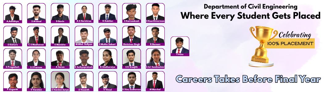The Civil Engineering Department, established in 2011, has rapidly emerged as a recognized research center affiliated with Anna University. With a strong emphasis on excellence in education and research, the department aims to foster innovation, promote sustainable infrastructure development, and address contemporary challenges in the field of civil engineering.