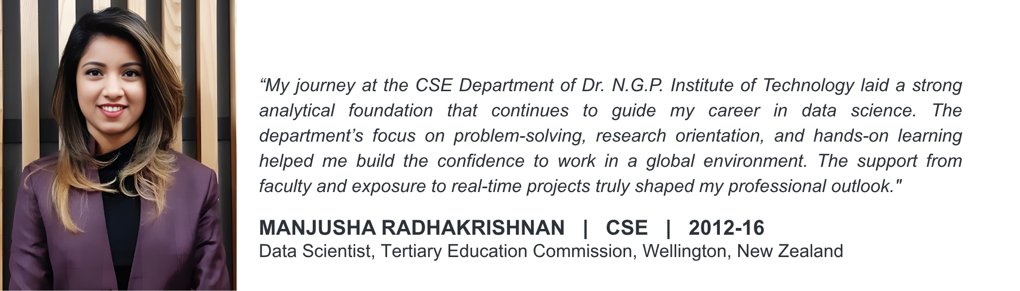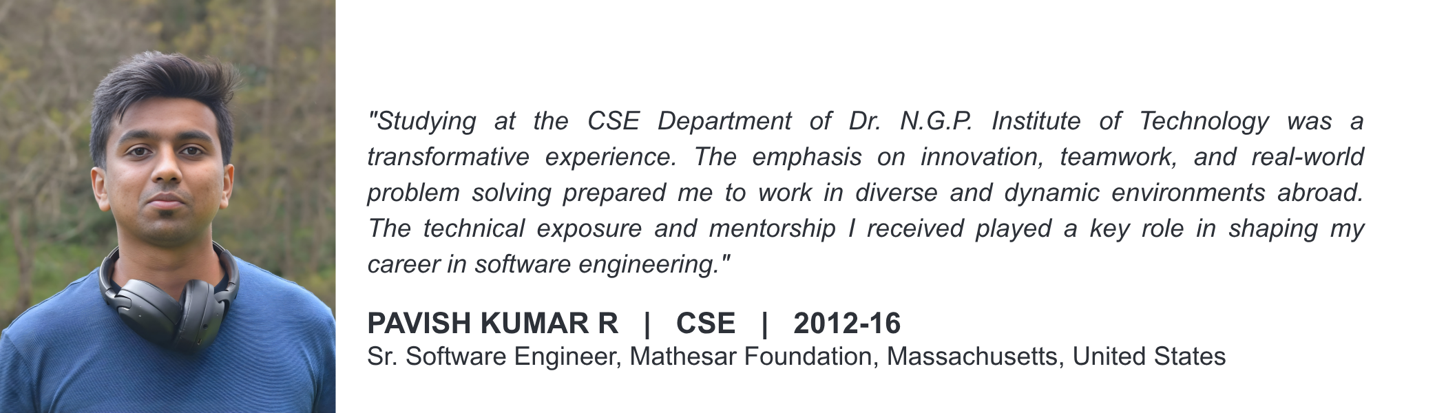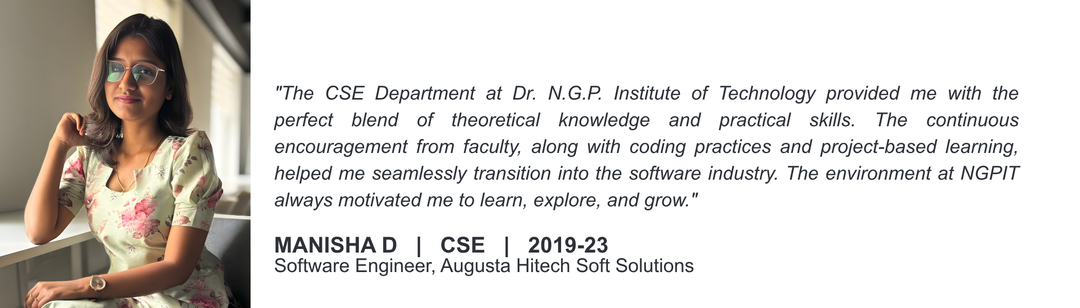 Listen to our alumni talk about their degree and life at Dr. NGP Institute of Technology, Coimbatore.