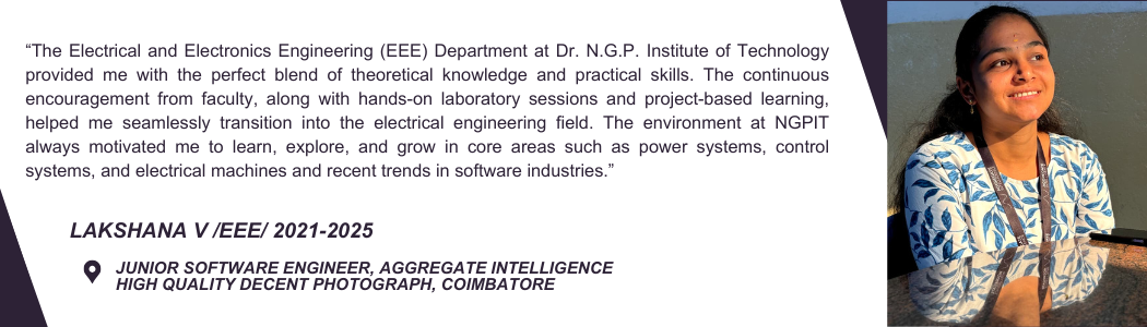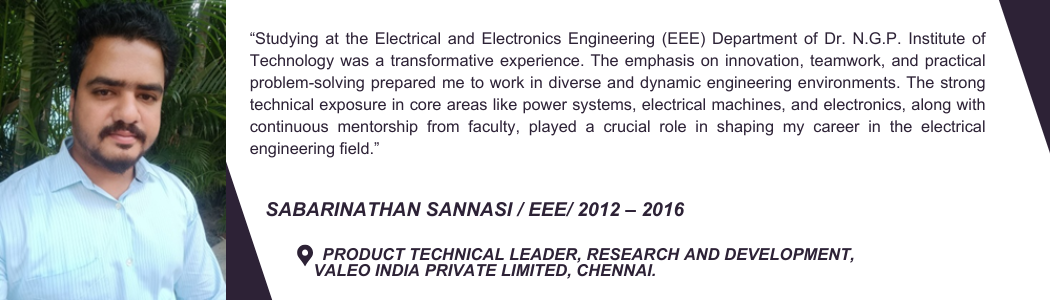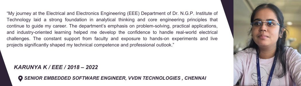 The Electrical and Electronics Engineering at NGPI Tech offers industry-focused specializations aligned with modern energy trends, helping students gain expertise in smart and sustainable technologies. The program emphasizes real-time project experience through strong industry collaborations, supported by well-equipped labs in circuits, power electronics, control systems, electrical machines, power systems, and electric vehicles for hands-on learning. It also provides strong placement support, valuable professional networking opportunities, and encourages research, innovation, and patent development.